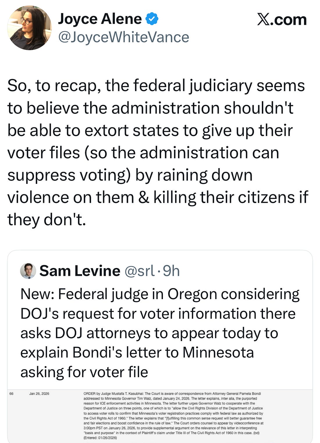 His Attorney General Pam Bondi’s offensive offer—give us your voter files, she said to Minnesota, and ICE will leave—was called into question by Judges in Oregon and Minnesota. It was clear the judges had questions, but they weren’t alone.